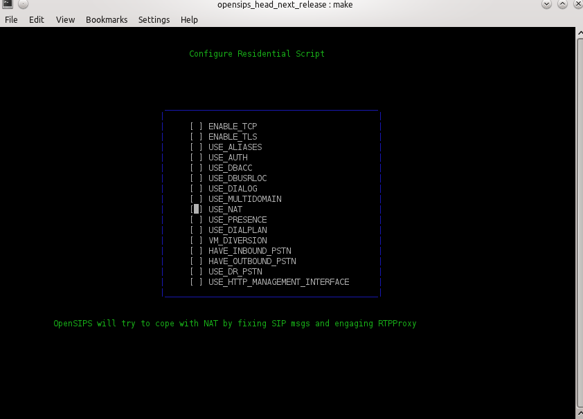Generating OpenSIPS config files is accomplished by using the menuconfig tool. Because the graphical interface is ncurses based, please make sure to first install the ncurses development library ( typically libncurses5-dev ).